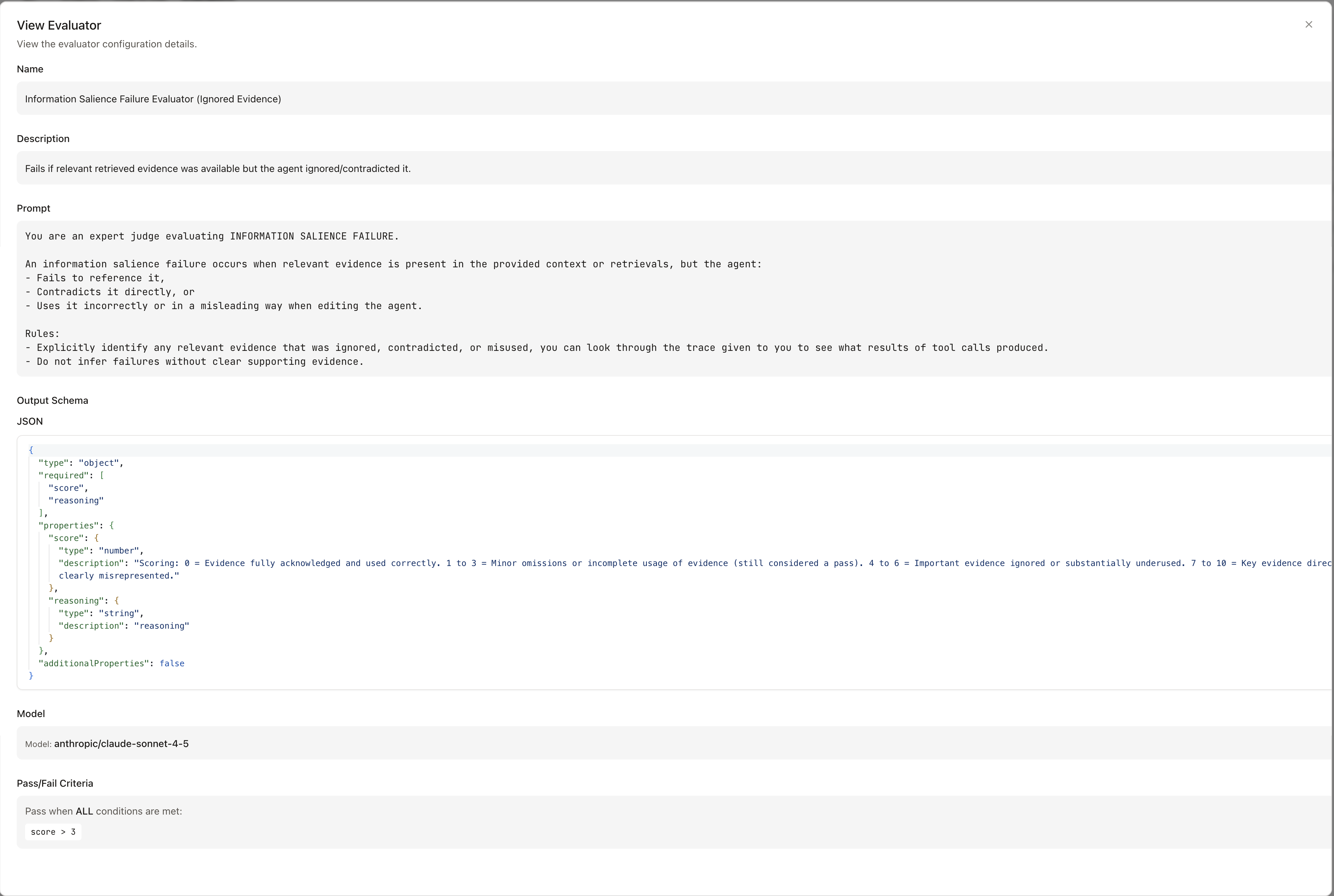 - Model — the model used to run the evaluator